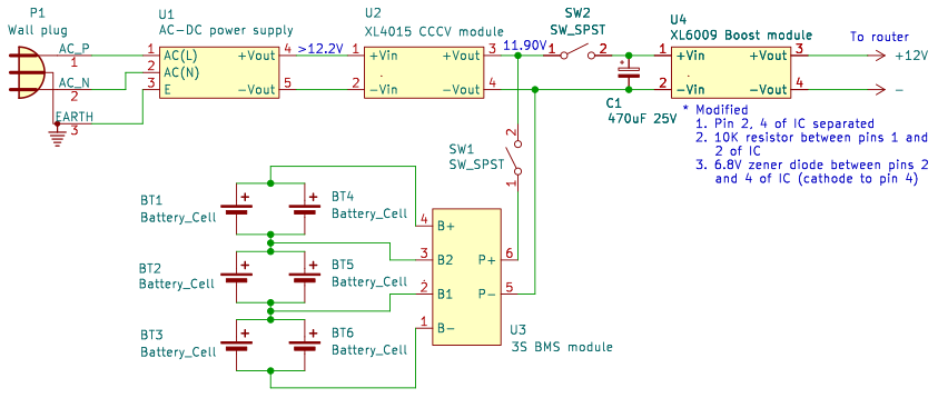- ආරම්භයේදී මම මගේ UPS එක සෑදුවේ C1 ලෙස පරිපථ සටහනේ ලකුණු කර ඇති කැපැසිටරය නොමැතිව. මම බැටරි සම්බන්ධ නොකර AC-DC පවර් ඇඩප්ටරය භාවිතා කර පරික්ෂා කිරීම් කළා. UPS එකට විදුලිය සපයා ඊට පසු රවුටරයට UPS එක සම්බන්ධ කරන අවස්ථාවේ XL6009 මොඩියුලයේ සහ XL4015 මොඩියුලයේ ප්රතිදාන වෝල්ටීයතාවයන් පහත වැටුනා. මම දුටුවේ රවුටරයට විදුලිය සැපයෙන ආරම්භක ක්ෂණයේ දී UPS පරිපථයේ වෝල්ටීයතාවයන් අසමතුලිත වන බව. මේ දෝෂයට පිළියමක් ලෙස මම C1 කැපැසිටරය යෙදුවා. එවිට එම ගැටලුව නැතිව ගියා.